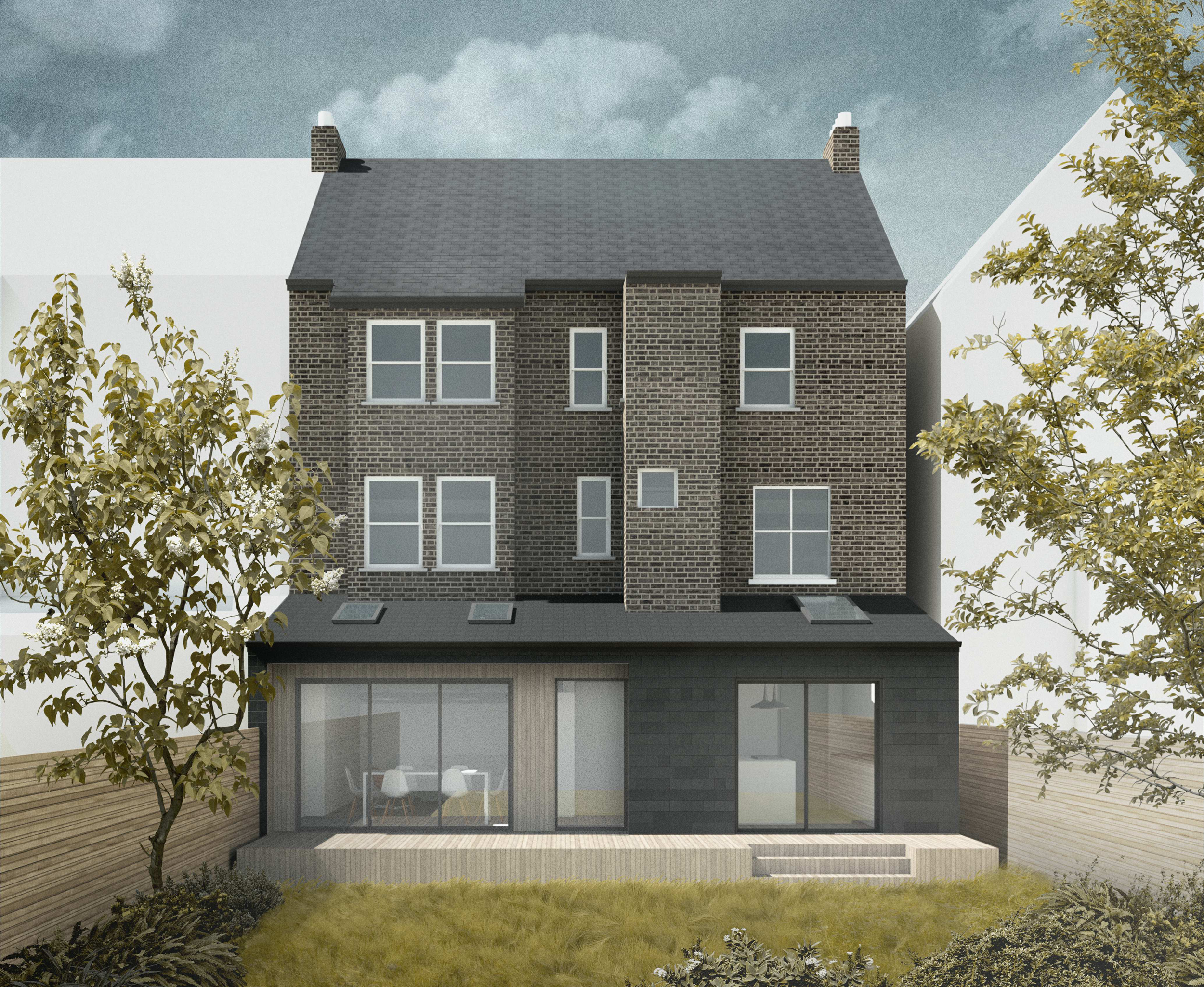 A new single-storey addition to the rear forms the primary intervention — a carefully proportioned volume that accommodates a kitchen, dining and sitting space in one open, flowing arrangement. The form is composed as a quiet counterpart to the existing house, stepping subtly to define a timber-lined terrace and to mediate between domestic scale and garden setting.